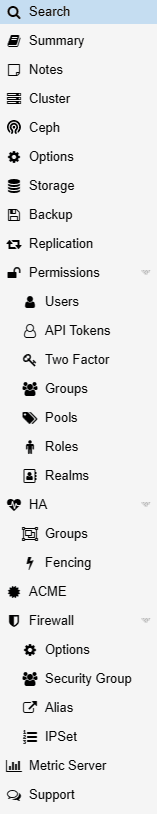 - Permet d’accéder à diverses configurations globales pour le cluster Proxmox. Les administrateurs peuvent utiliser cette section pour configurer des paramètres globaux qui affectent l’ensemble du cluster Proxmox.